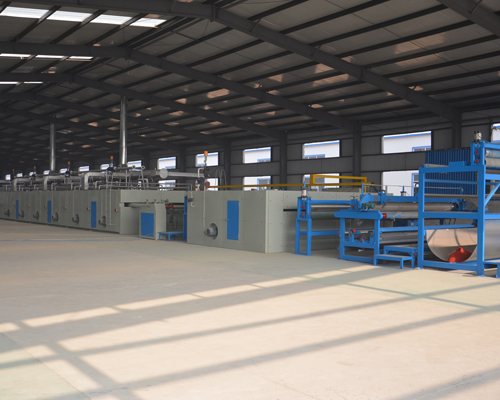 Blank blanket unwinding and storing cloth → brushing dust → pre-steaming → weft straightening →-coating back glue (spraying or roller coating) → upper three-proofing → rolling and pressing compound → drying setting machine → cold air cooling → cloth storage rack → rolling device